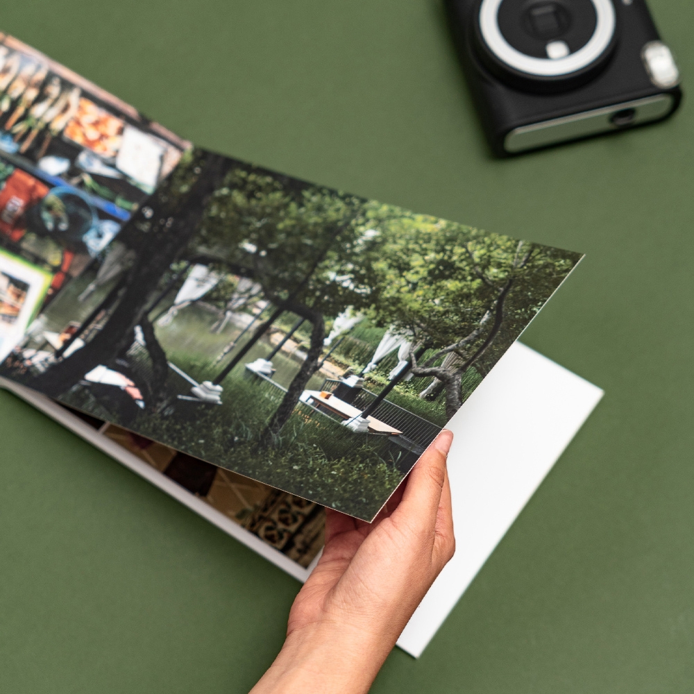 A abertura panorâmica, combinada com a impressão em papel fotográfico Fujifilm de alta qualidade, oferece uma visualização contínua das suas fotos, sem cortes ou partes ocultas.